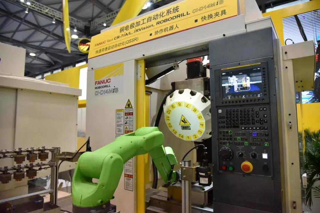 使用FANUC α-D14MiB小型加工中心进行铜电极工件加工,使用CR-7iA/L协作发那科机器人进行铜电极自动上下料